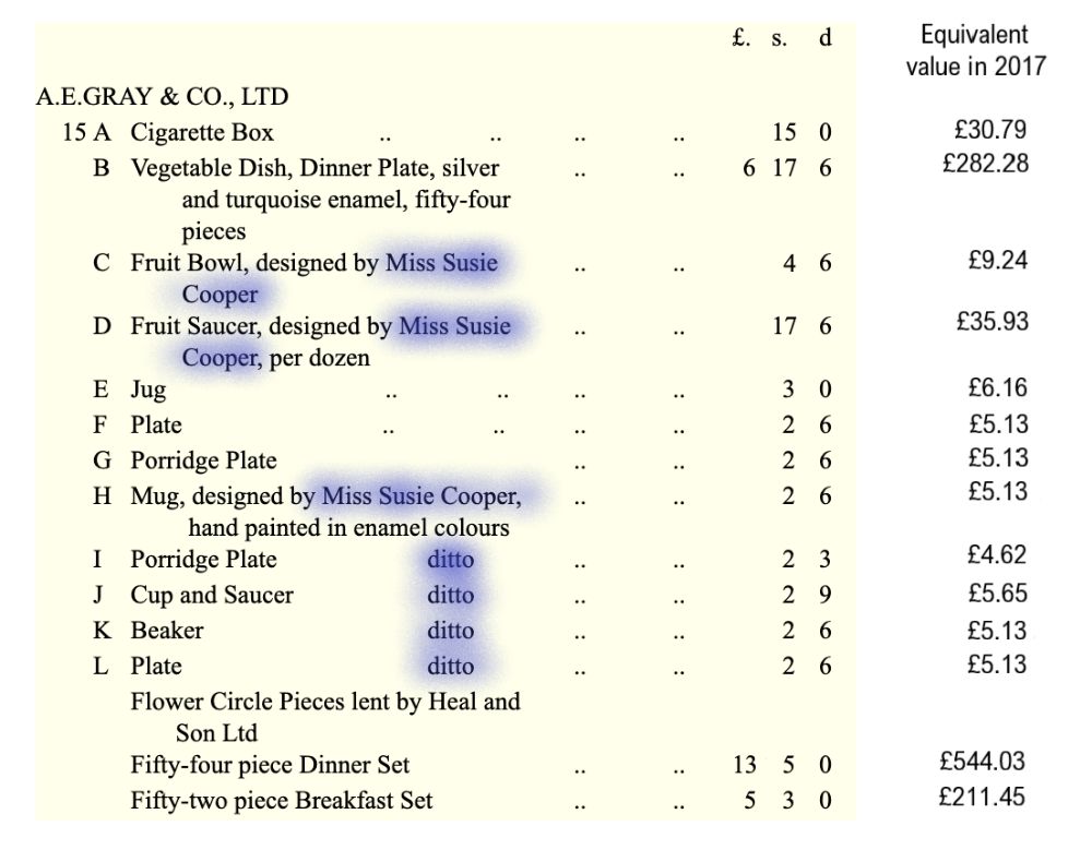 Despite the lack of concrete evidence regarding what exactly Miss Cooper designed while at Gray’s Pottery, her name does appear in the detail of various exhibition lists, notably those of the British Institute of Industrial Art in 1927 and 1929 (see below).