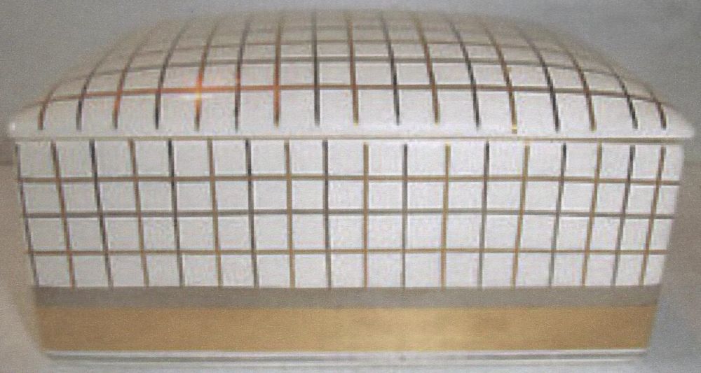 The lidded box has the letters B.I.F. alongside the pattern number, an indication that the pot was suitable for display at a British Industries Fair, but no guarantee that it was actually displayed.