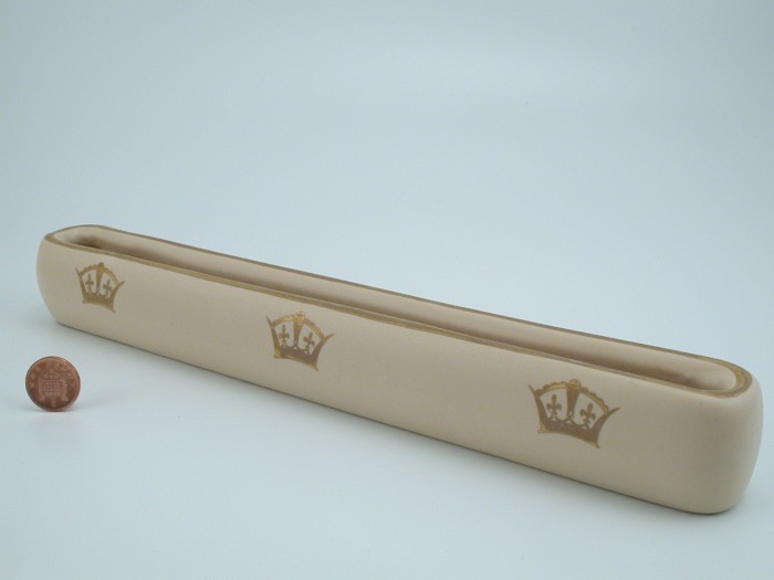 These flower troughs seem to have been popular in the mid-to-late 1930s. They are found in a range of forms and sizes: straight, semi-circular and round and are all likely to have been made undecorated by Kirklands of Etruria, specifically for Gray’s Pottery to decorate.