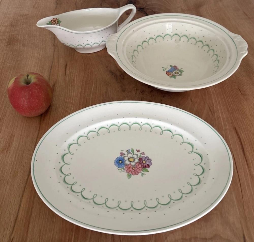 This design has been recorded with no shaded band, with a blue band, with a green band, as described in the Pottery and Glass article: … available (for export only, of course) with groundlay in a variety of colours – Spanish grey (often marked pattern A8692/1), pink, silver brown, stone and turquoise, and also with a plain uncoloured background.