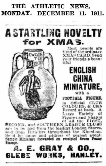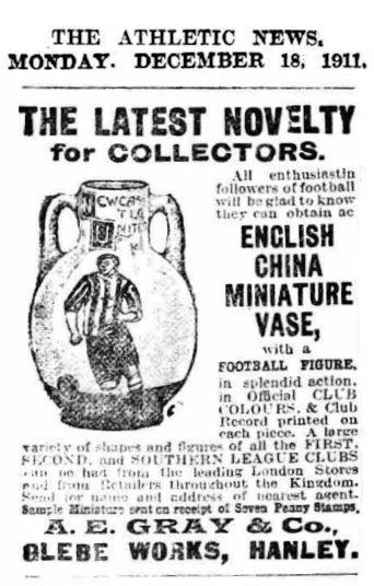 The question of “why did Gray’s Pottery made these small ‘souvenir’ items in the very early days of the company’s existence?” still remains unanswered. Similarly, the question of “how did Gray’s advertise or promote such pots?” has been elusive. Research into the very limited range of football club ‘programmes’ which have survived (often just single sheets listing the match players of the day) has not been fruitful.
